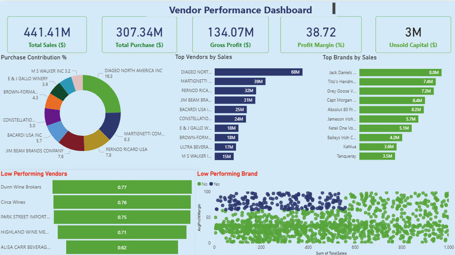 To analyze vendor and brand performance in order to improve sales, profitability, and inventory efficiency within retail and wholesale operations.Dataset: