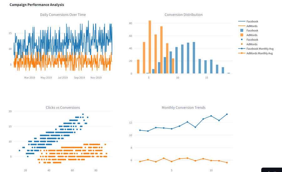Identify which ad platform (Facebook vs AdWords) delivers higher conversions, clicks, and ROI for 2019 campaigns.Dataset: