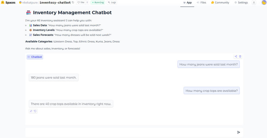 Developed a Flask-based AI chatbot powered by OpenAI GPT-3.5 Turbo and Linear Regression forecasting models to enable real-time inventory, sales, and forecasting insights through conversational interaction.Key Features:Conversational Analytics: Chatbot interface for querying inventory, sales forecasts, and category-level trends.