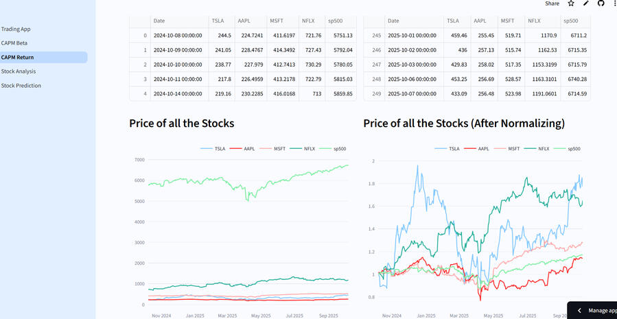Developed a Streamlit application for stock analysis, price prediction, and financial modeling, enabling traders and investors to make data-driven decisions using technical indicators, ARIMA forecasting, and CAPM risk analysis.Key Features:Stock Analysis: Real-time financial metrics, RSI, MACD, moving averages, and interactive candlestick charts.